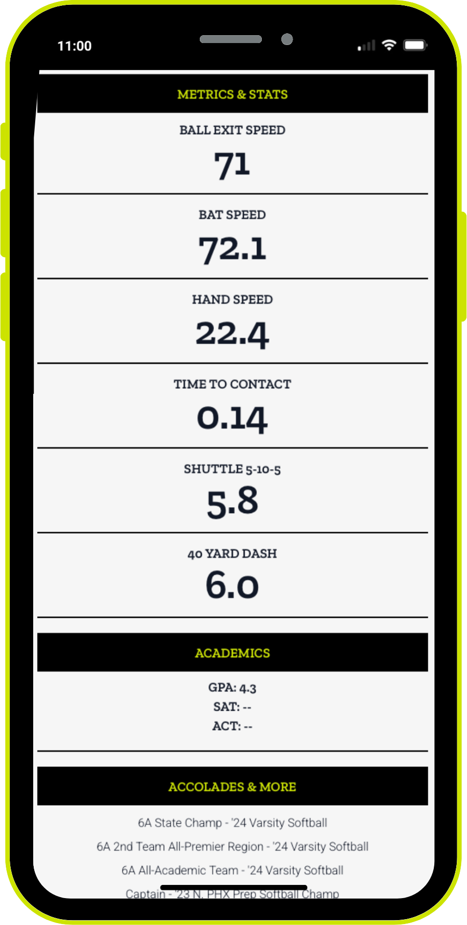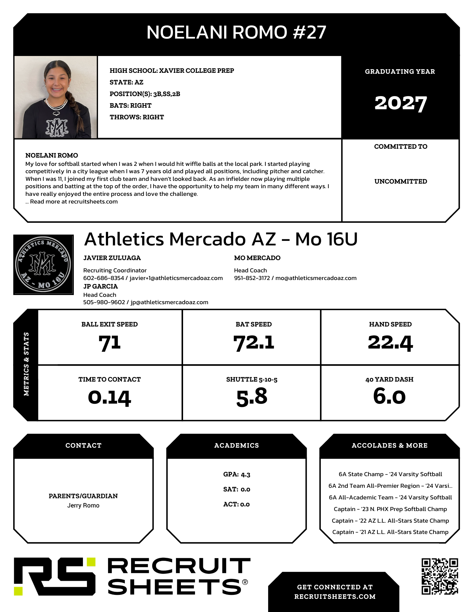 Recruit Sheets creates team and athlete profiles based on college coach feedback—showing exactly what they want, how they want it. You add the details, we do the rest. Instantly share with a QR code or print for events. No design work. No formatting. No-brainer.