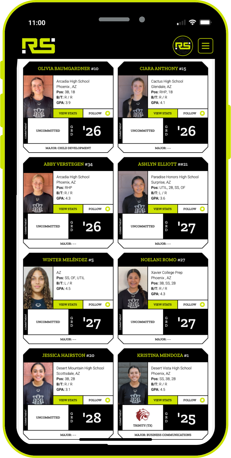 Invite athletes to fill out their own profiles, or enter the info for them. Quickly hide athletes who aren’t attending an event. Print a field card with your team’s QR code and logo to showcase at tournaments, making it easy for recruiters to scan and view your team in seconds.